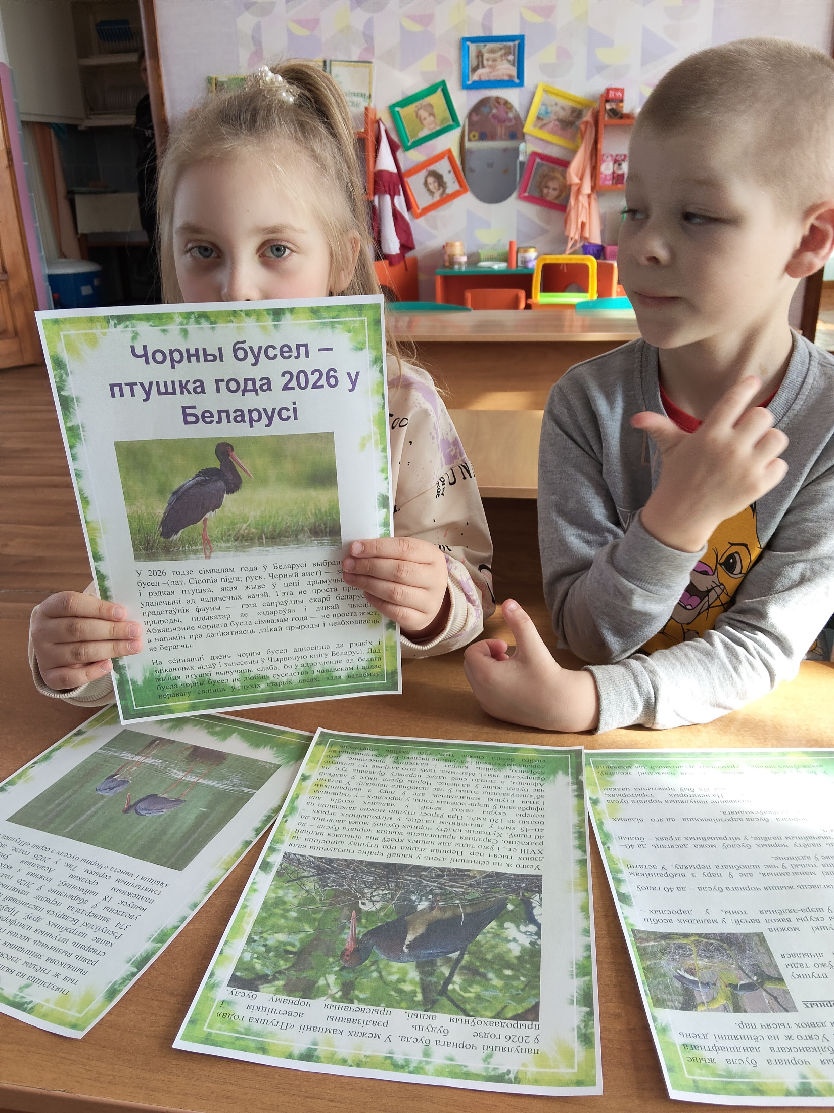 З 16 па 20 сакавіка у групе інтэграванага навучання і выхавання дзяцей ад чатырох да шасці гадоў прайшоў тэматычны тыдзень “Пералётныя птушкі”, пад час каторага выхаванцы ўспомнілі і замацавалі назвы пералётных птушак Беларусі. А таксама пазнаёміліся з чорным буслом, які з’яўляецца птушкай года ў Беларусі. Выхаванцы даведаліся, што на сённяшні дзень чорны бусел адносіцца да рэдкіх і знікаючых відаў і занесены ў Чырвоную кнігу Беларусі. Лад жыцця птушкі вывучаны слаба, селіцца ў глухіх старых лясах, каля вадаёмаў. Вынікам тыдня стала стварэнне папкі-перасоўкі “Чорны бусел – птушка года 2026 у Беларусі”.