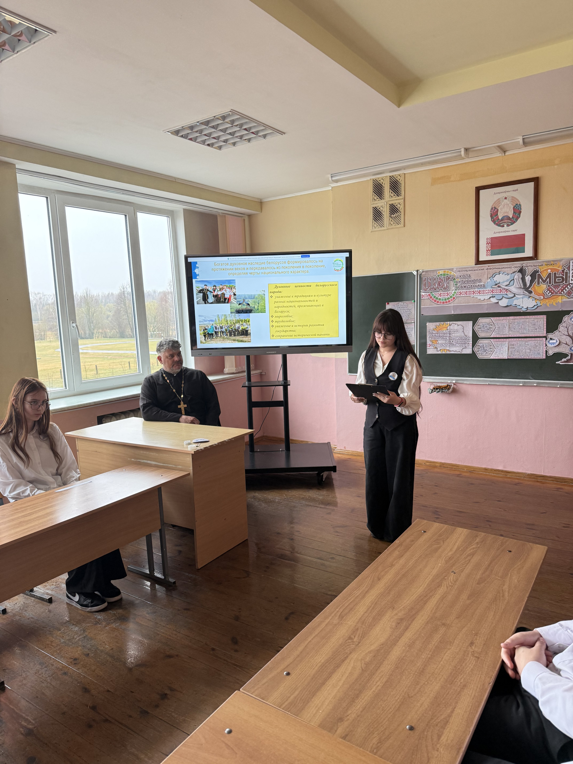 31 марта 2026 года учащиеся 8 класса приняли участие в Школе Активного Гражданина тематический урок на тему: "Быть достойным гражданином Республики Беларусь - значит разделять и поддерживать духовные ценности белорусского общества". Мероприятие прошло с участием настоятеля прихода храма святого Архангела Михаила д. Изабелин, отца Сергея. Цель мероприятия заключалась в том, чтобы познакомить школьников с важностью духовных ценностей для становления гражданина, готового внести свой вклад в развитие своей страны. Отец Сергей выступил с проникновенным рассказом о значении духовности, моральных устоев и культурны традиций для поддержания общественного порядка и согласии с моральными принципами и активно участвовать в жизни общества, поддерживая те ценности, которые лежат в основе белорусской нации. После лекции состоялась живая дискусия, в ходе которой школьники смогли задать вопросы, поделиться своим мнением и получить ответы на темы, связанные с гражданственностью и духовностью. Мероприятие стало важным шагом в воспитании патриотизма и нравственных ценностей среди молодежи, способствуя более глубокому пониманию роли каждого гражданина в поддержании устойчивости и гармонии в обществе.