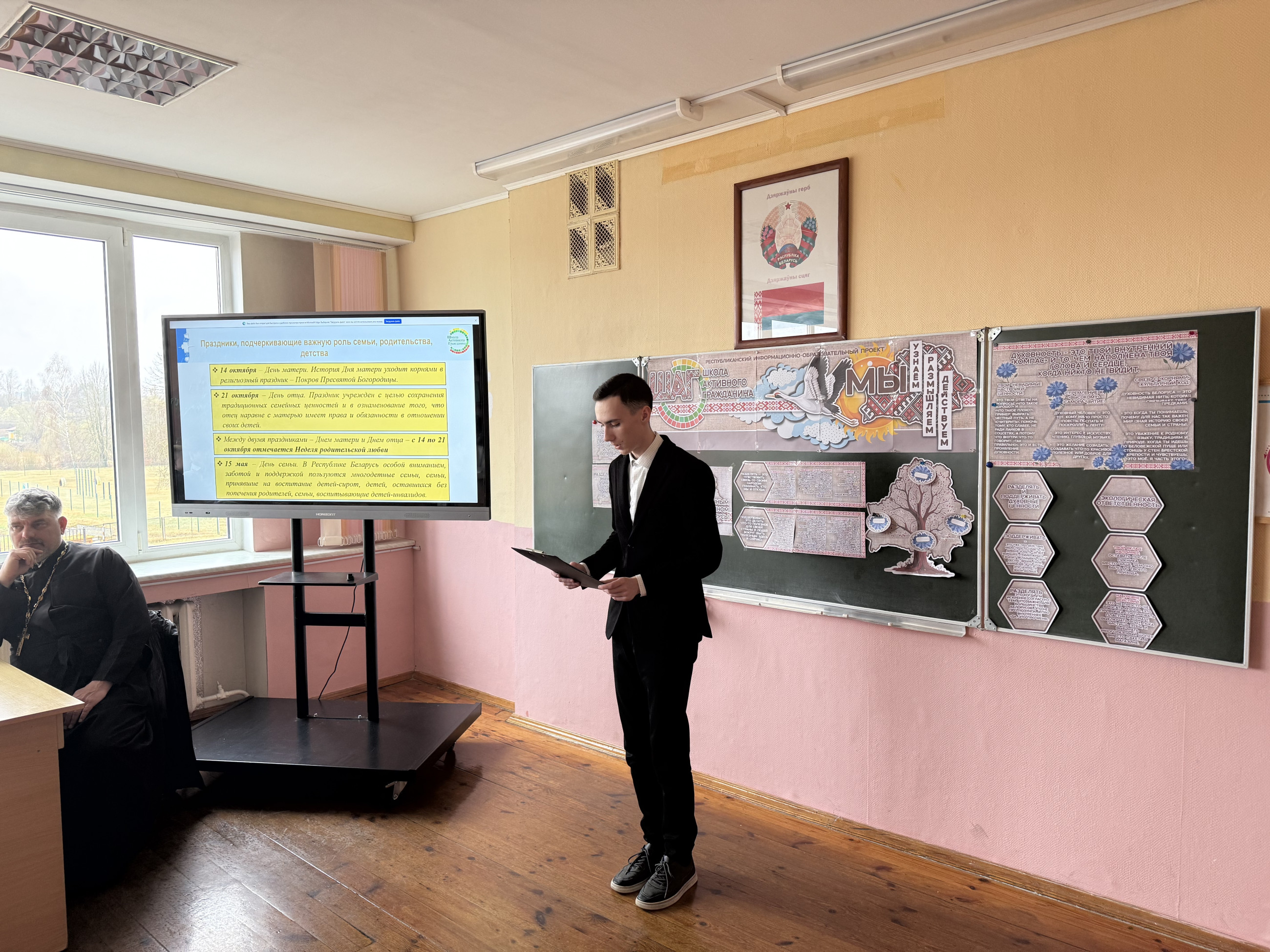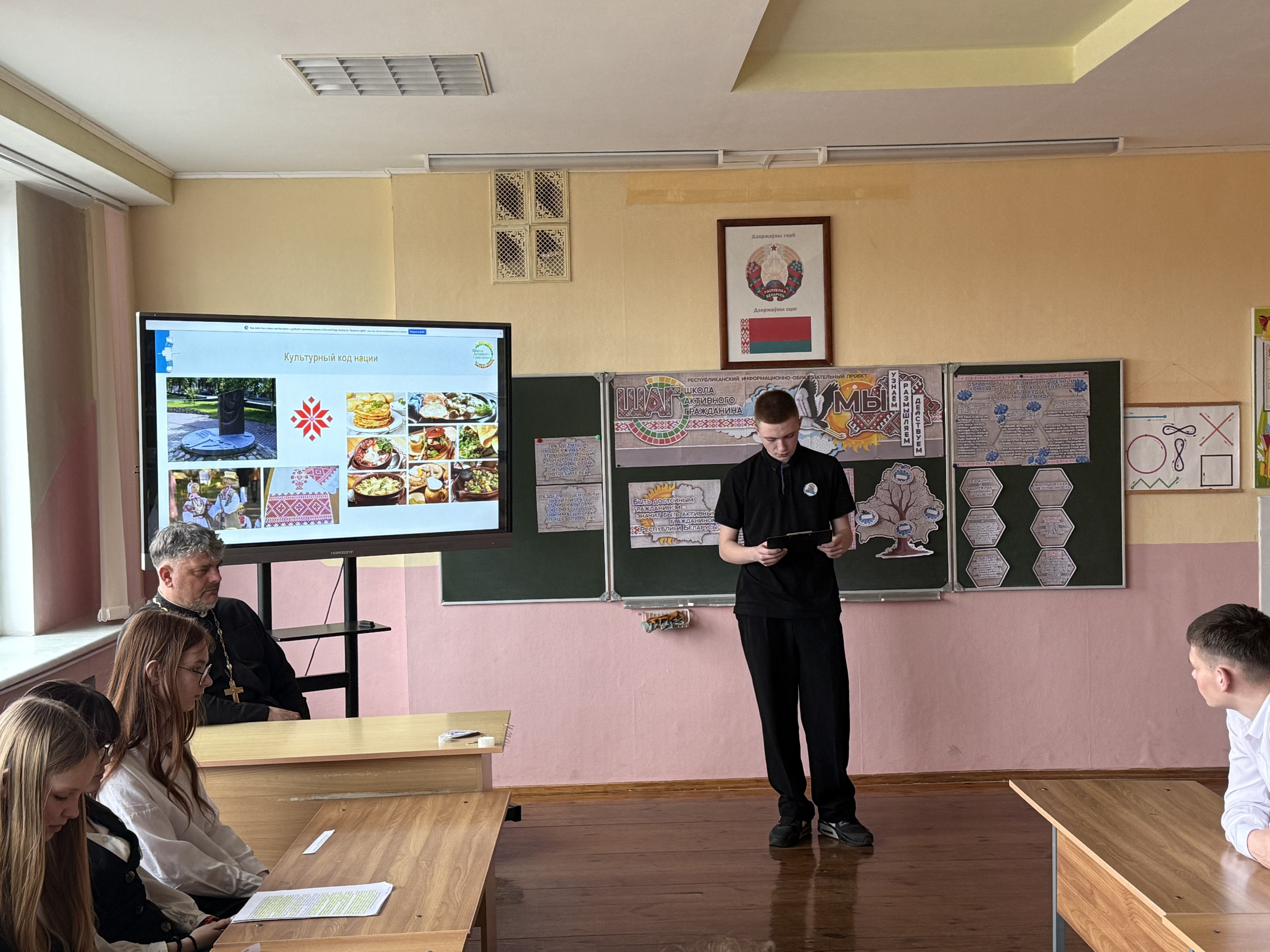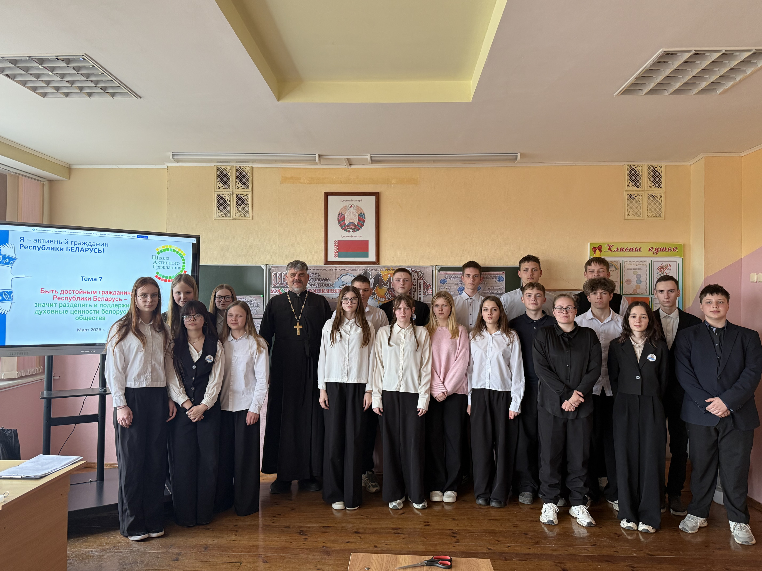 31 марта 2026 года в рамках ШАГ для учащихся 8-11 классов был проведен тематический урок на тему: "Быть достойным гражданином Республики Беларусь - значит разделять и поддерживать духовные ценности белорусского общества". Мероприятие прошло с участием настоятеля прихода храма святого Архангела Михаила д. Изабелин, отца Сергея. Цель мероприятия заключалась в том, чтобы познакомить школьников с важностью духовных ценностей для становления гражданина, готового внести свой вклад в развитие своей страны. Отец Сергей выступил с проникновенным рассказом о значении духовности, моральных устоев и культурны традиций для поддержания общественного порядка и согласии с моральными принципами и активно участвовать в жизни общества, поддерживая те ценности, которые лежат в основе белорусской нации. После лекции состоялась живая дискусия, в ходе которой школьники смогли задать вопросы, поделиться своим мнением и получить ответы на темы, связанные с гражданственностью и духовностью. Мероприятие стало важным шагом в воспитании патриотизма и нравственных ценностей среди молодежи, способствуя более глубокому пониманию роли каждого гражданина в поддержании устойчивости и гармонии в обществе.
