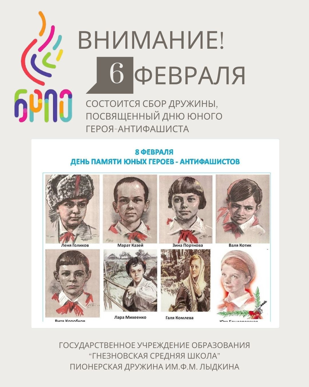 6 февраля, в преддверии Дня юного героя-антифашиста, в пионерской дружине имени Федора Максимовича Лыдкина состоится сбор дружины «Строки памяти»